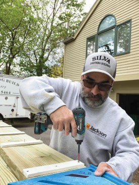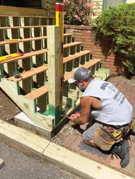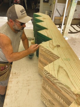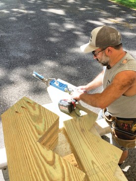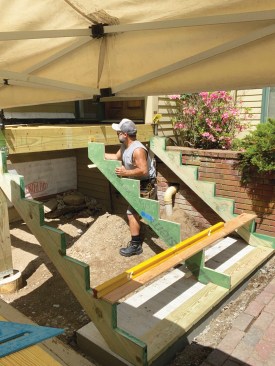 To prevent rot, he applied preservative to the cuts and notches on the stringers and the landing plate.