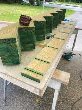 Without a doubt, this method proved to be slower than cutting the stringers out with a saw, but I was pleased with the result: perfectly identical stringers. To keep them that way—since pressure treated stock has a bad habit of moving around once it’s been cut and notched—I screwed each stringer to the previous one as I completed it before moving on to the next. Then, before leaving for the day, I gave all the cuts a couple of coats of copper naphthenate preservative.