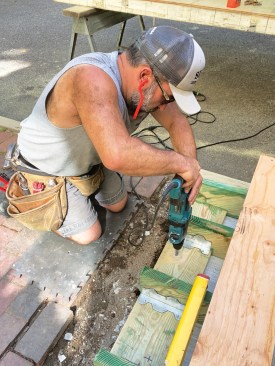 The undersized 8-inch-diameter pier supporting the corner post needed to be replaced with a 12-inch-diameter pier. While digging around the pier to pull it out of the ground, I discovered that it was resting on a big spread footing that must have been placed when the house foundation was poured. While there was no way to remove it without a machine, it was buried below frost level, and my inspector approved my plan to pin the new pier to the existing footing with rebar dowels drilled and epoxied into the footing.