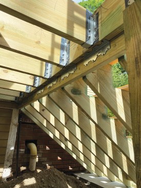 With the plate placed on the slab, I screwed structural screws through the sides of the two end stringers into the ends of the plate; the remaining seven stringers were notched to fit over the plate. To fasten the stringers to the deck framing, I drove structural screws through pocket holes into the rim joist. I also fastened a dropped header to the rim joist with metal angles and drove screws through the header into the stringers. After installing the stringers, I anchored the plate to the slab with wedge bolts.
