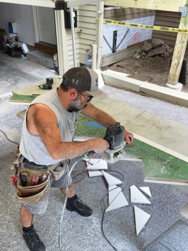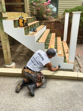 To match the appearance of the original porch, the homeowner specced clear vertical-grain fir for the railing, decking, and treads, which I prefinished on all four sides with a solid stain. I emphasized that this choice would require regular maintenance but was able to talk him into PVC post sleeves and stair risers. I also covered the stringers with PVC trim, using my template to accurately lay out and cut the stringer trim.