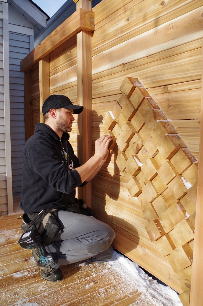 I cut the blocks in 1 ½-inch, 2-inch, 2 ½-inch, 3-inch, and 3 ½-inch lengths from a western red cedar 4×4 post, taking a palm sander to the face and corners to remove any splinters and smooth out the roughness from the cut. The blocks are fastened to the cedar fence slats with Titebond III waterproof glue and screws driven through the slats into the back of the block. To avoid potential splitting, we pre-drilled for the screws, and used a single screw per block.