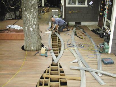 Once the main curved pieces were installed, I needed to fill in the remaining holes with Tropics Jatoba decking. I didn’t anticipate how difficult that would be. Each piece needed to be traced from the bottom, which required one person on top to hold the board, and one person underneath the deck to trace (Figure 5). Often, the joists or the blocking got in the way of the line. Then for the lower deck, I decided that what had looked good on paper did not look right in practice. Fixing the error required new blocking underneath the deck — a much more difficult task now that the decking was in place.