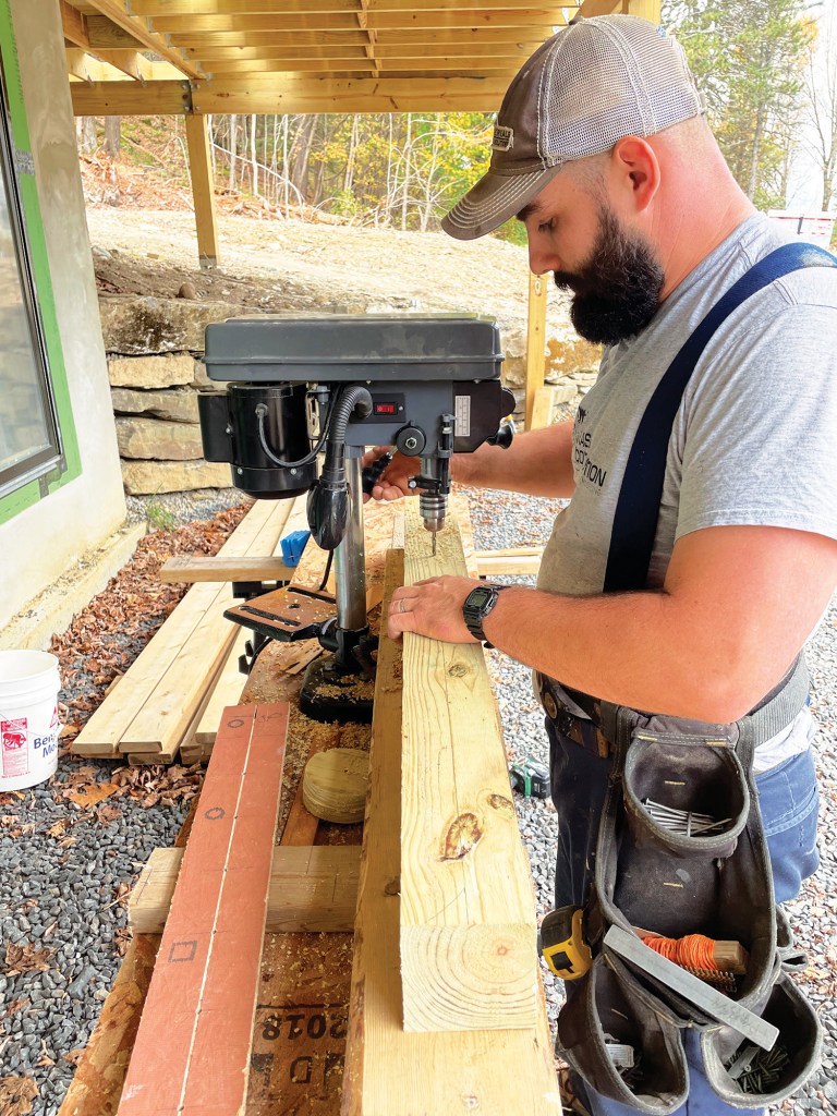 HeadLok structural screws were used to fasten the 2×6 top rail to the posts; to create a slight recess for the broad-headed screws, the author predrilled the screw holes with a Forstner bit.