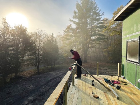 We eased over all the end cuts with a 1/4‑inch roundover bit on a cordless router to match the long edges of the boards from the mill. For now, the client has chosen to leave the decking unfinished.