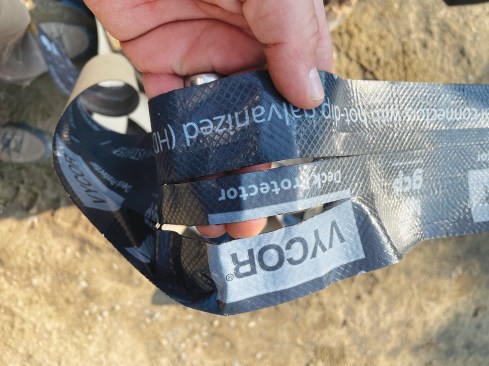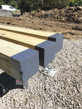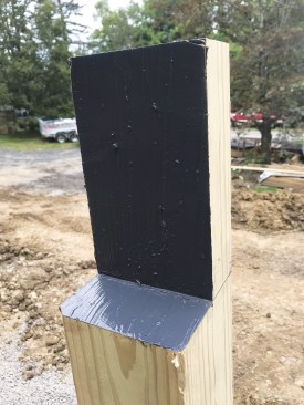 Prior to installing the 6×6 support posts, Ed Backus applied liquid flashing membrane (above) to the post bases (below left) and the notches for a 2-ply dropped beam (below right). Backus first wrapped the posts with masking tape to give the application a finished look.