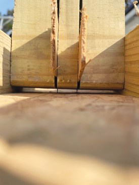 To ensure that the visible fastener heads would be aligned, the author snapped chalk lines on top of the pressure treated decking to mark the joist layout. The width of the deck was planned so that there would be no ripped deck boards; decking was installed from the ledger out toward the rim joist.