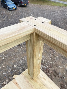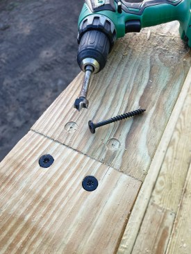 Top rail. The top rail (some people call this a “drink rail”) of our railing system is a pressure treated 2×6 on the flat, running over the tops of the 6×6 corner posts and the intermediary 4×4 posts. A 2×4 rail runs post-to-post under the 2×6 creating a “T.” We fastened the 2×4 to the 2×6 from the underside using 4-inch-long GRK Multi-Purpose Screws, countersunk 1/2 inch into the 2×4.