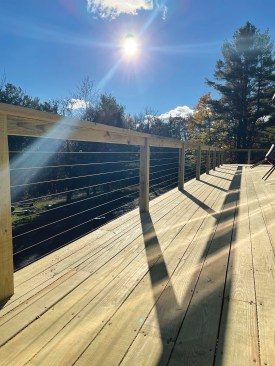 The home sits on a heavily wooded private lot on the Helderberg Escarpment in upstate New York. The scenery from the deck is beautiful, and the client didn’t want to interrupt the view with the railing system that was suggested by the architect: a wood railing built with a 2×4 top rail fastened to 4×4 posts with typical 2×2 balusters. Instead of balusters, I suggested using a steel “hog fence” balustrade, but the client instead suggested cable rail.