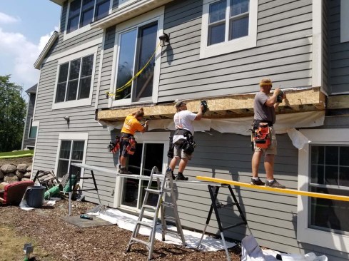 The existing first-floor system was framed with 11 7/8-inch I-joists, which would allow us to slide our 9 ½-inch deck I-joists alongside them until they rested on top of the wall plate. First, though, we had to remove the soffit below the cantilever and then cut away some of the spray foam used to insulate the joist bays. Luckily, the original insulation contractor didn’t do a very good job insulating the cantilever, so there were a number of voids that were missing foam. This made removing all of the foam in the cantilever a bit easier.