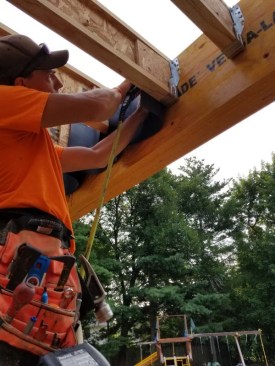 We started to see the benefits of using I-Joists over standard green treated lumber almost immediately. For one thing, the joists are consistently sized, so the top-flange I-joist hangers we used could all be set to the same height, making them much quicker and easier to install than standard joist hangers. We were able to lay out and install all of the hangers on both the ledger and the beam and then simply drop each joist into place.