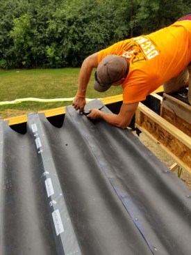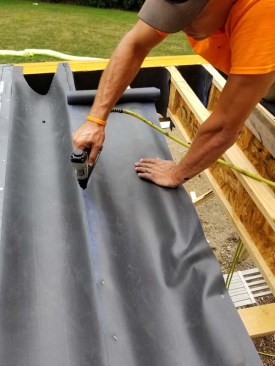Next, we installed the troughs, starting at the house. We tucked each trough up behind the housewrap 6 inches and sealed it to the sheathing with neoprene flashing cement. We then stapled the troughs down along one entire joist before starting over at the house on the other side. Since the troughs were tapered, installing one edge of the rubber along the edge of the joist automatically created a pitch away from the house as the trough started tight and loosened up at the front rim. To ensure that water will flow into the bib and gutter, we trimmed away any excess trough material.
