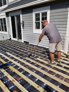 2×4 sleepers installed 12 inches on-center over the framing and waterproofing system simplify decking installation. The author paints the sleepers black to keep them from telegraphing through the gaps in the decking.