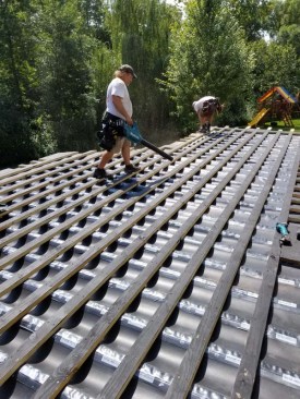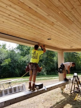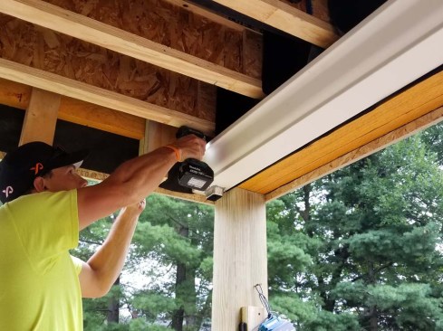 After one more water test, we moved on to finishing the underside of the deck. First, we installed an aluminum gutter system across the front edge to direct the water from the bibs out into the landscaping. After the electrician installed the recessed lighting cans and 110-volt wiring, we finished the ceiling with 5 ½-inch WP4 tongue-and-groove cedar.