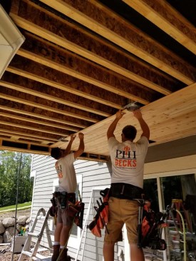 Best of all, our deck was perfectly flat right away, compared with one framed with conventional PT lumber, where getting the joists installed is just the first step in framing it. Next, we would have to install midspan blocking every 6 feet on-center to help straighten out any cups in the joists. What we couldn’t fix with midspan blocking, we would then have to plane down to get everything lined up, a tedious and time-consuming – but absolutely critical – step.