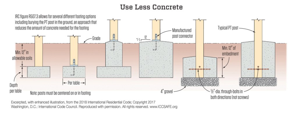 Alternatively, the final method shown in Figure R507.3 extends concrete to the surface. In areas of deep frost, that is a lot of concrete, in which case it probably makes sense to use either the third or fourth detail and keep the posts above grade. All the methods shown in R507.3 should satisfy your building inspector, but if you do choose to sink your posts, you just can’t do it the way you probably have in the past. ❖