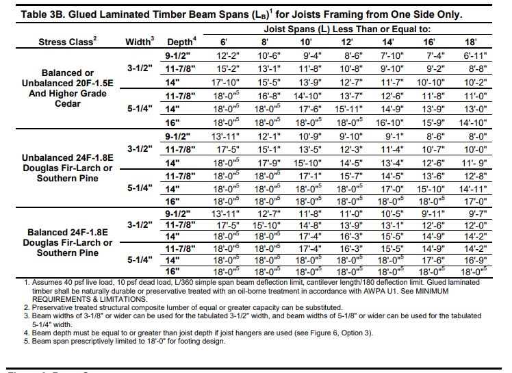 Table 3B in the American Wood Council’s DCA 6 Prescriptive Residential Wood Deck Construction Guide provides allowable spans for glulam beams that are either preservative-treated or made of a naturally durable wood species, such as cedar. However, except for a footnote to Table 3B that allows treated structural composite lumber (SCL) of equal or greater capacity to be substituted for the glulam beams in the table, DCA 6 does not address the use of SCL members–such as laminated veneer lumber (LVL), parallel strand lumber (PSL), laminated strand lumber (LSL), and oriented strand lumber (OSL)–in decks.