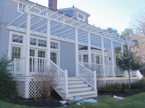 The porch had a pergola supported by PermaCast columns. Because the tops of the columns hadn’t been capped when they were originally installed, water had gotten inside them, causing damage to the decking underneath. Otherwise, the composite columns were in good shape, although the pergola they supported was not. Built with common framing-grade material, the beams and rafters were overdue for replacement.
