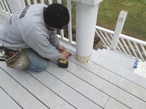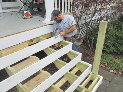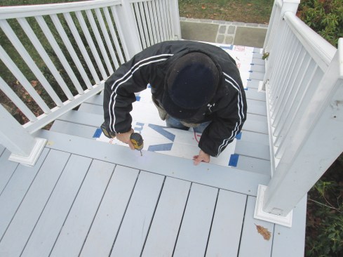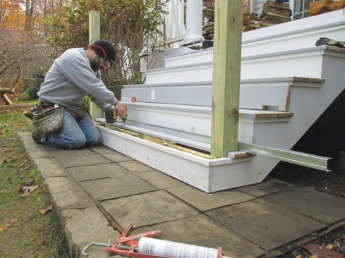 Then he face-screwed new 5/4×6 treads to the framing after the PVC skirts and risers were installed.