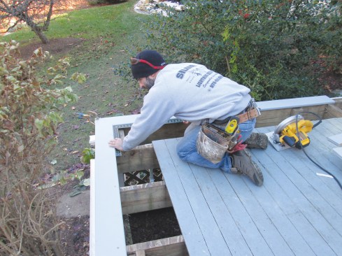 Because the owner wanted to reuse the railings, I carefully mapped out the locations of the columns as I removed them prior to replacing the decking. Then, to ensure that the railings would fit snugly when I reinstalled them, I had to make sure to place the columns back in exactly the right places.