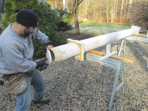 I wanted to keep water out of the columns, so I also cut round PVC plugs for their tops. I capped the columns with the plugs and a bead of sealant before installing the 4×6 red-cedar beam, which is spliced with a lap joint over one of the columns.