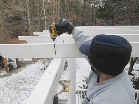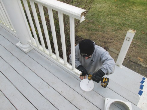 … then slipped the columns over the plugs and screwed them in place. This ensured that the columns would be reinstalled in their original locations and that the railings could be reused.