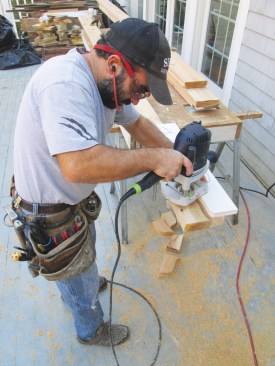 To duplicate the profile that had been cut on the tails of the original rafters, I made a pattern to clamp to the ends of the new 2×6 red-cedar rafters and use as a template. I cut the rafter tails with a bearing-guided flush bit, and then I primed and painted the rafters.