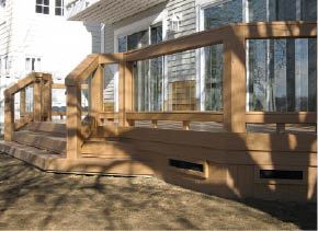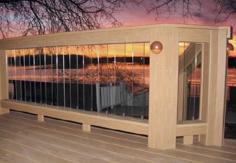 Building a deck is about more than erecting an outdoor structure in someone’s backyard. It’s also about providing homeowners with a place to anchor memories of gatherings with family and friends and of quiet times alone watching the sun going down. The deck pictured here was built by Creative Wood Products, owned by Paul Bollinger and Steve Darby in Fenton, Mich. To complement the Gossen Passport PVC decking, they used Deckorators glass balusters, Aurora Deck Lighting Nebula post lights, and Dekor stair lights. The matching railing is Wolmanized lumber wrapped with Gossen Passport PVC in the same Moroccan cedar color as the decking, fascia, and skirting. – Laurie Elden