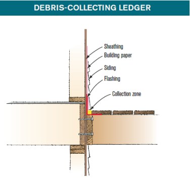 It’s common practice to bring an L-shaped flashing down the wall and kick it out over the ledger, the resulting pocket can collect debris.