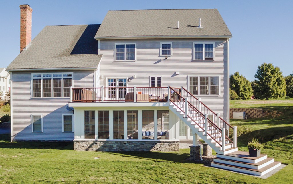 After we installed the screen window panels and door, we finished trimming out the room. Finally, we reinstalled the vinyl siding that had been removed to install the deck ledger and tie the new double-decker deck to the house. ❖