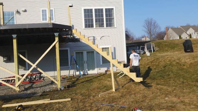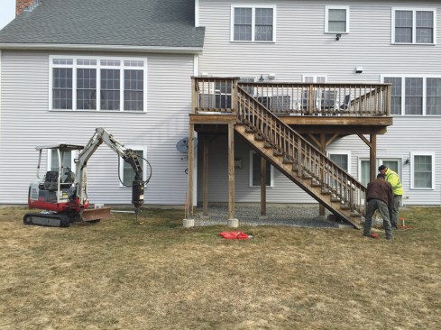 While workers dismantled the original upper level deck, helical pile footings were installed for the new deck.