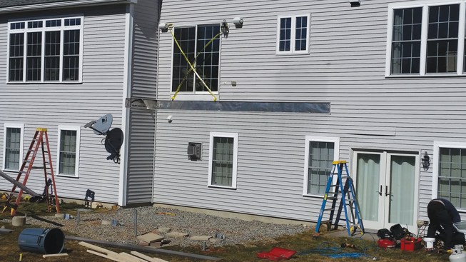 After removing the existing deck and installing new helical piles, workers started pulling back the siding in order to install an expanded deck ledger for the larger deck.