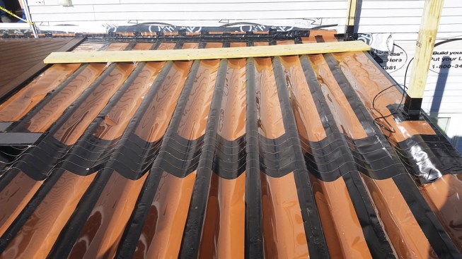 To create the dry space underneath the deck, we installed a Trex RainEscape system, which consists of proprietary downspouts, 20-mil trough material, and compatible flashings, single and double-sided tapes, and sealant. We always install the troughs to have the maximum amount of fall from one end of the joists to the other, which increases the velocity of the water flow and helps keep the troughs clear of organic debris.