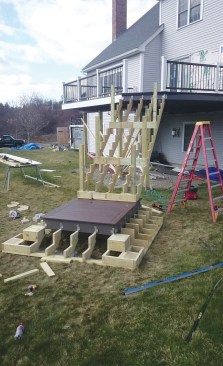Later, after we had reframed the new deck, we removed the old concrete piers. Typically, we pull old piers out of the ground with an excavator, but when we can’t remove them for some reason (such as limited site access), we break them off below grade and bury them.