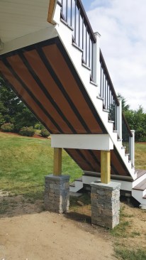 The distinctive stair design was driven by the homeowners’ request to be able access the stair landing from three sides to accommodate future plans for their backyard, including a possible inground pool. Because of the way the staircase extends out from the corner of the deck and into the yard, it is clearly visible from multiple directions, including from inside and outside the house and from within the enclosed area underneath the deck. To give the assembly a finished look, we wrapped the stringers with PVC trim and installed a “ceiling” on the underside of the staircase.