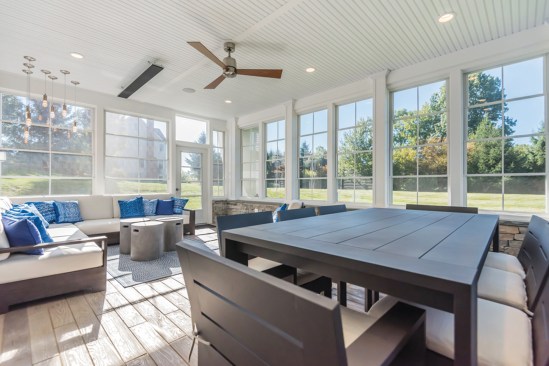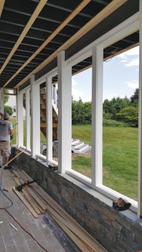 After strapping the joists for the beadboard ceiling, we framed the window and door openings with PT 2x4s and trimmed them with PVC. While we were working on the deck design, the clients had been researching screening options for their new space. They settled on EZ-Screen units, which are multi-track aluminum frames fitted both with sliding screens and with aluminum-framed 10-mil vinyl panels. They ordered the units early on in the project, and they were delivered to the site preassembled. One of the benefits of using this company was that only a few weeks of lead time were required, instead of a couple of months for similar products from other manufacturers, which helped keep our schedule on track.