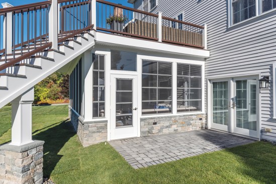 The clients wanted the new three-season porch underneath the deck to feel completely separate from their indoor spaces, so there’s no direct access to that area from inside the home. To provide a solid subfloor and base for the screen porch’s knee walls, we poured a concrete slab with a thickened perimeter. Then we laid up the CMU knee walls, which are clad with natural stone veneer finished with a bluestone cap.