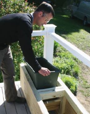 We prefer plastic containers that we can drop into a wood frame. They are quick, reliable, and — when you factor in the labor costs of other methods — relatively cheap. The self-watering EarthBoxes (888/917-3908, earthbox.com) used in this project cost about $30 each (Figure 1).
