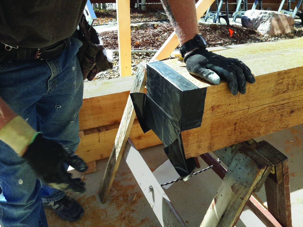 For example, we like to add a layer of self-adhering flashing tape (such as Grace’s Vycor window tape, though there are other brands that will work just as well) to the bottom of our support posts before installation, which separates the bottom of the post from the surface that it is bearing on. In the job shown here (see photo, above), we wrapped 8×8 cedar posts with 6-inch-wide tape, overlapping it so the tape extended up all four sides of the post.