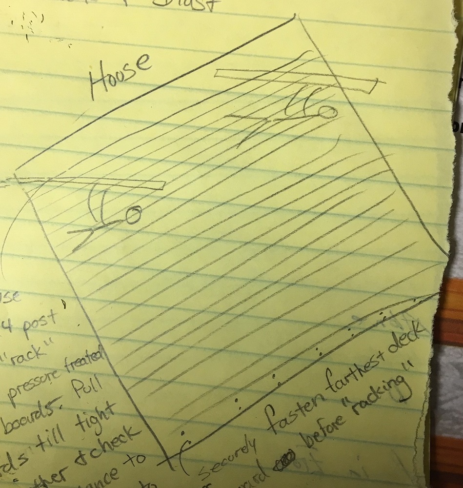 Instead of installing pressure-treated decking one board at a time, we use what we call our “rack and roar” method. It’s quick, it works great with wet PT lumber, and it’s especially effective in straightening bowed boards.