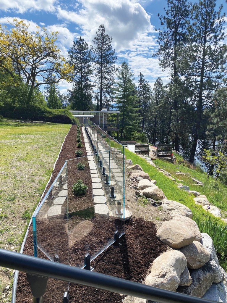 Our customer, who lives on a tranquil river flowing through Washington’s Spokane Valley, decided to remove a 6-foot-tall hedgerow that was blocking his river views and replace it with a retaining wall topped with a frameless glass railing system. A landscaper was contracted to build the retaining wall, while our job was to install the glass fence.