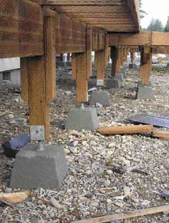 As in Florida, frost isn’t an issue in Santa Barbara, Calif.; Bolton’s footings, which he pours in place, are shallow and easily dug. Hence, he uses more of them and lighter framing — 4×6 beams and 2×6 joists in most cases.