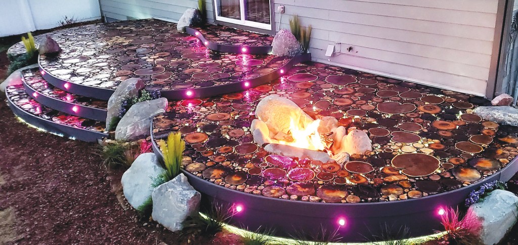 To encase the lighting cables and provide a substrate for the log-round decking, the author applied 10 coats of clear epoxy on top of the sheathing.