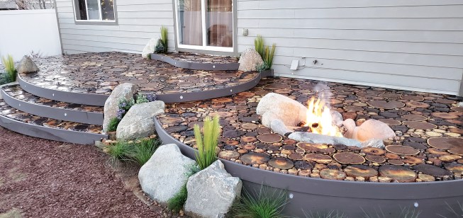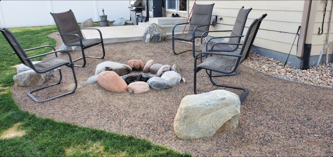 After removing the existing patio, the author repositioned the fire ring and landscape boulders and stabilized them with concrete.