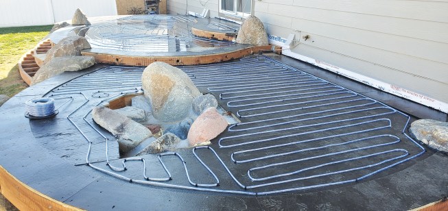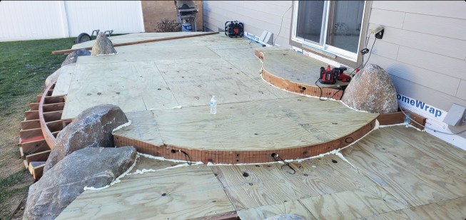 The author then sheathed the deck frame with pressure treated plywood, filling gaps in the sheathing and around the boulders with spray foam.