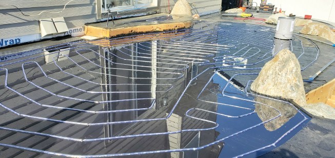After the deck was sheathed, we filled small gaps in the subfloor around boulders and plywood seams with spray foam, then scraped away the excess after the foam had cured to end up with a continuous and well-sealed substrate for the resin. Then we applied several coats of rubberized sealant to the entire assembly, creating a reasonably watertight seal to hold the epoxy while it cured.