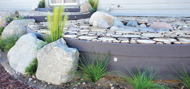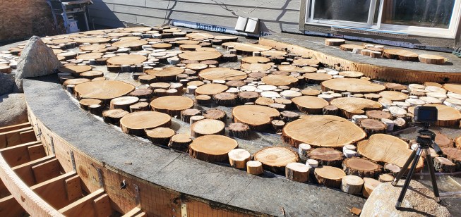 The author cut thousands of log rounds from a variety of sizes and species of wood that he had acquired from a number of different local sources for the decking.