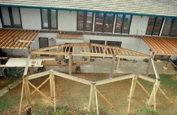 Figure 11. Before the beams are placed in their pockets, the wood is treated with a borate preservative. Note the torch-down roofing membrane applied to the beam and post tops in the background.