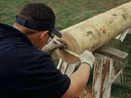 Logs can be finished products or raw material fresh from the forest. The latter will need to be debarked, which can be done with a draw knife or an adze (Schroeder Log Home Supply; 800/359-6614, www.loghelp.com). Logs fresh cut in the springtime when the sap is running can be debarked using a power washer at 3,500 psi or greater with a turbo nozzle. This method leaves the smooth cambium layer of the wood intact. You can also use an electric plane.