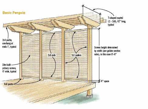 I believe in the KISS (keep it simple, stupid) principle when it comes to designing pergolas and arbors; most of mine spring from one simple design (Figure 1). My basic pergola usually runs along one side of a deck, appears T-shaped when viewed from the end, and is filled in with vertical lattice panels, which create a privacy screen. This last feature in particular is an easy sell, as it goes a long way toward distinguishing a deck while offering shade and privacy.